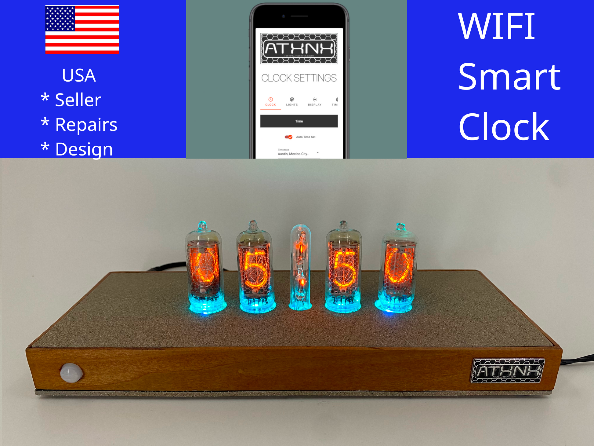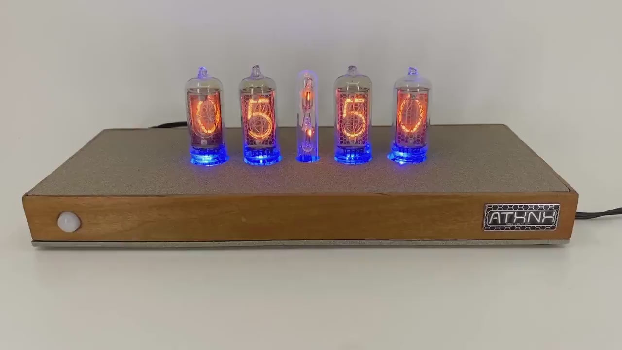 Retro meets modern in this medium nixie clock. Designed/Programmed and Crafted by hand in Austin, TX USA from international parts. Your clock is a numbered original with a certificate of authenticity by the original creator. Own a piece of history with this showpiece for your home or office. Photos are of the clock being sold.