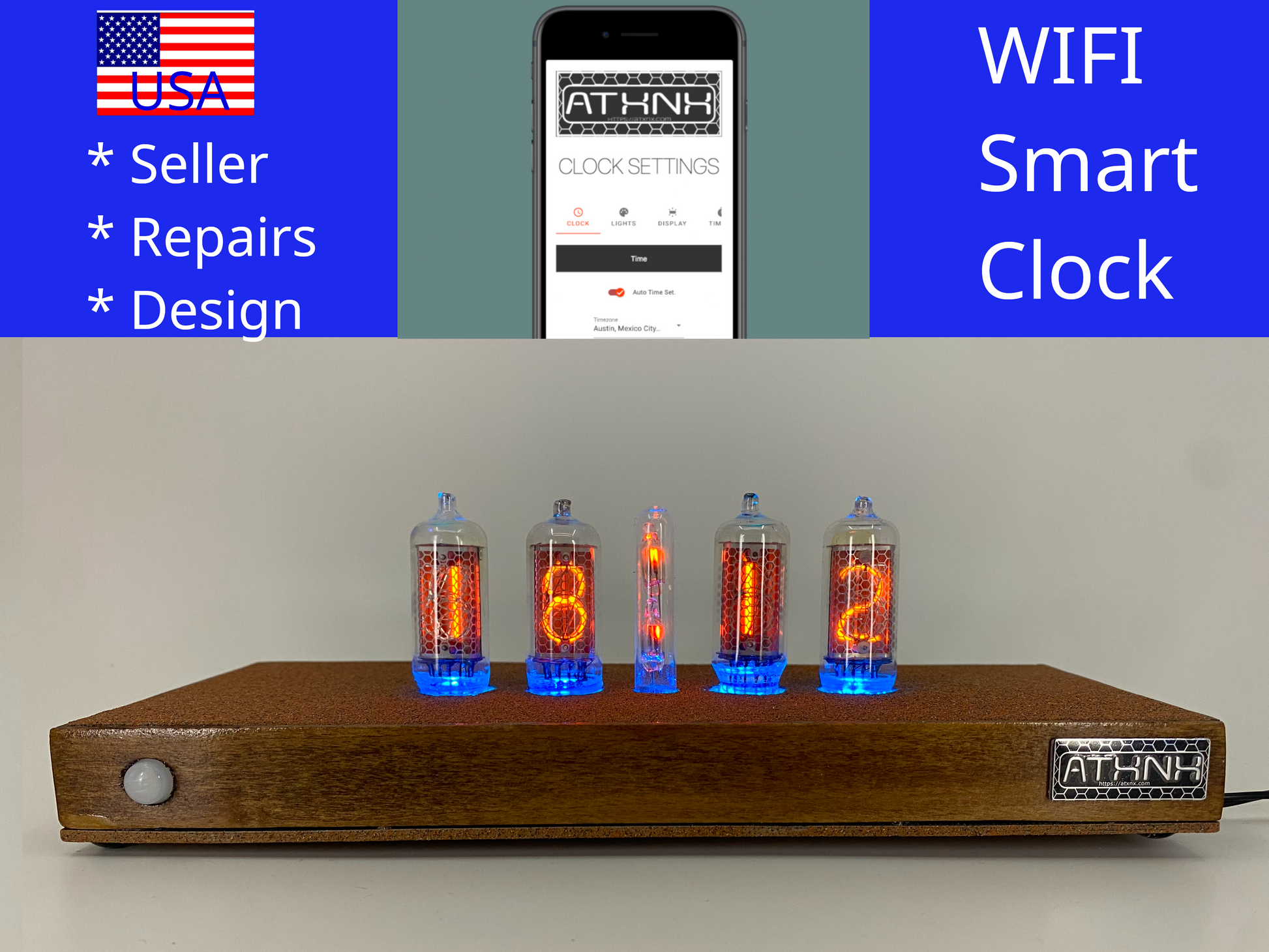 Retro meets modern in this medium nixie clock. Designed/Programmed and Crafted by hand in Austin, TX USA from international parts. Your clock is a numbered original with a certificate of authenticity by the original creator. Own a piece of history with this showpiece for your home or office. Photos are of the clock being sold.